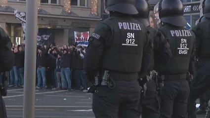 Am Samstagnachmittag haben sich ca. 3500 Fans von Eintracht Frankfurt rund um den Leipziger Marktplatz versammelt, um gemeinsam zur Red-Bull-Arena zu ziehen. Bereits am Mittag zogen Fans von Connewitz Richtung Leipziger Innenstadt. Dabei blieb es laut Polizei bis auf ein paar Böllerwürfe verhältnismäßig ruhig.