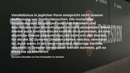 Dynamo Dresden schrieb nicht nur sportliche Schlagzeilen beim Auswärtssieg in Aachen (1:0), sondern fiel vor allem durch Vandalismus der Fans auf. Wie Videos nach dem Spiel zeigten, zerstörten Teile der Dresdner Fanszene die Sitzschalen und beschmierten die Wände in den Sanitäranlagen.