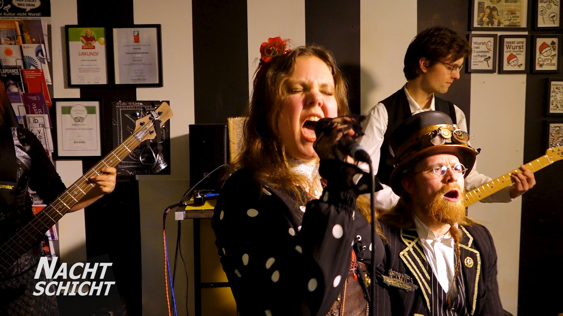 Dresden, Nachtschicht, Steampunk, Dresdner Neustadt, Curry und Co., Sophia Matthes, Susanne Meyer-Göt,z Simone Meyer-Götz, Talk, TV, Video, Sendung, Zahnrad, Mit Zahnrad und Zylinder, Zylinder, Steampunk Meißen, Steampunker, Jessnes, Musik, Folk, Band, Zahnrad, Zeitreise, Zeit, Sachsen, Chemnitz, Leipzig, Meißen, Festival