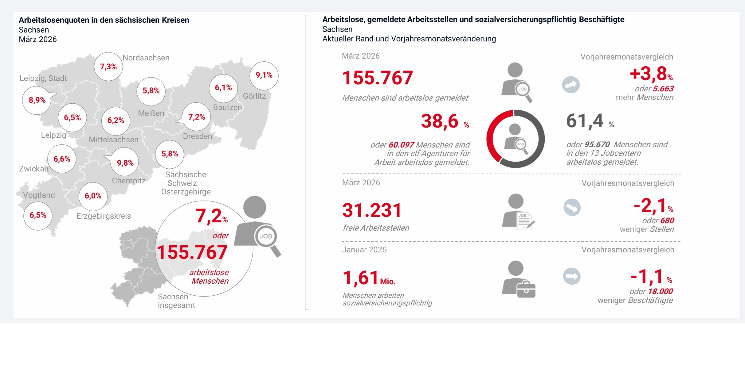 Chemnitz - Die Arbeitslosigkeit in Sachsen ist im März 2026 leicht zurückgegangen. Insgesamt waren 155.767 Menschen im Freistaat ohne Arbeit. Das sind 1.771 Personen weniger als im Februar, jedoch 5.663 mehr als im März des vergangenen Jahres. Die Arbeitslosenquote liegt aktuell bei 7,2 Prozent.