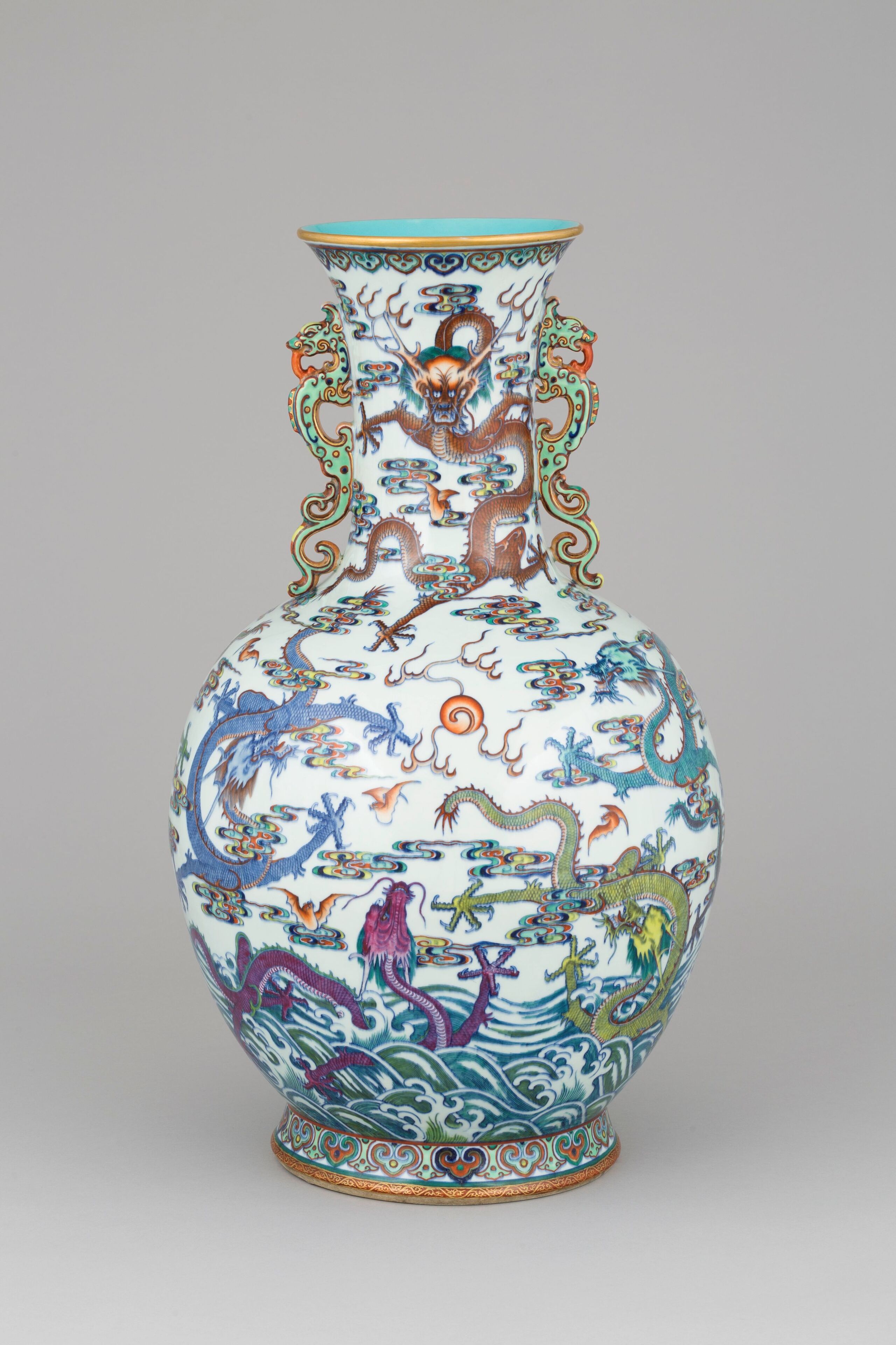 Neben der Ru-Schale ist auch eine sogenannte Drachenvase ausgestellt. Sie wurde für den Hof des Kaisers Qianlong gefertigt, der von 1735 bis 1795 regierte. Die Vase ist mit neun Drachen bemalt, die über Meer und Himmel aufsteigen. Nach Angaben der SKD gilt sie als seltenes Meisterwerk der kaiserlichen Porzellankunst der Qing-Dynastie. In der chinesischen Kultur steht die Zahl Neun demnach für Ewigkeit, der Drache wiederum als Symbol kaiserlicher Macht.