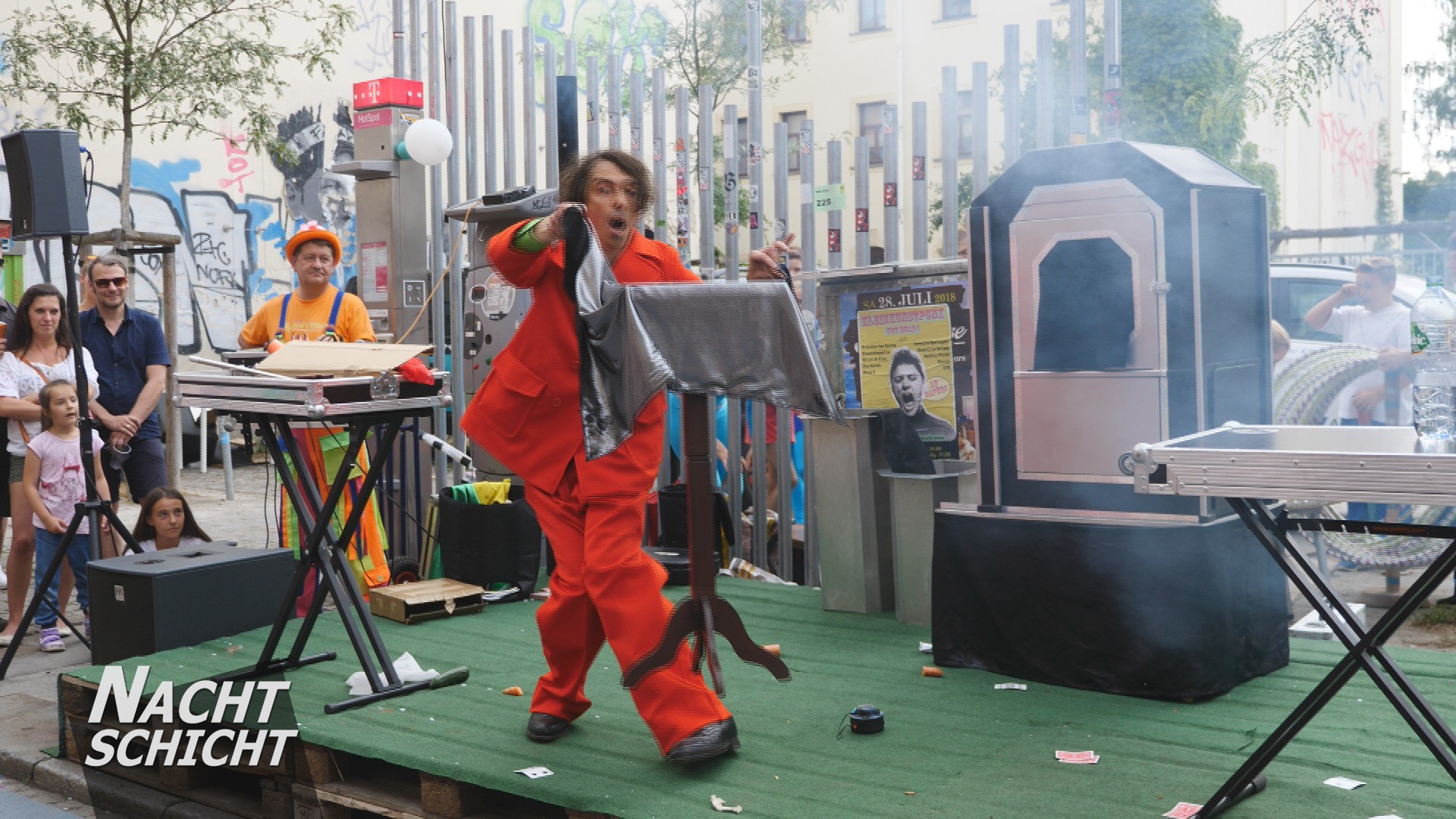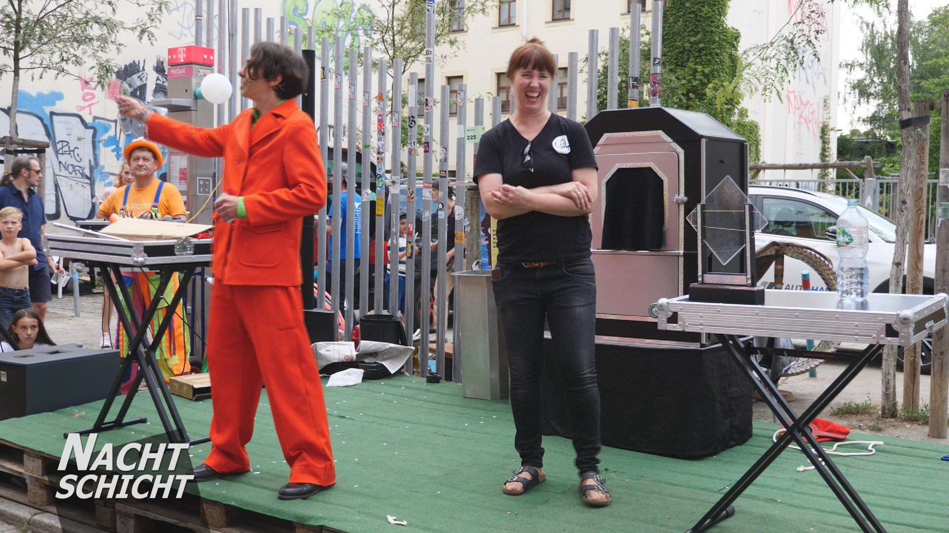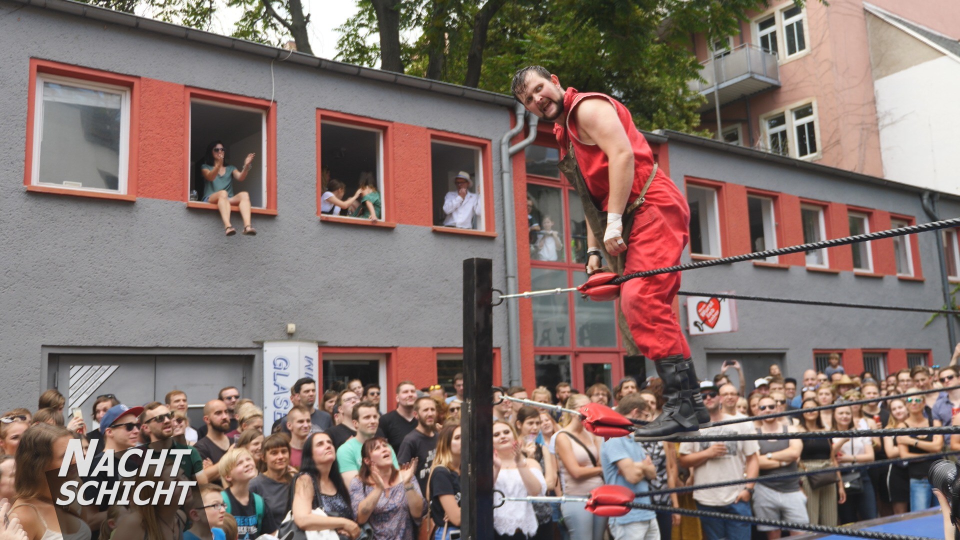 In der Nachtschicht haben wir die Insel "Rummel dir einen" auf der Louisenstraße erkundet. Der Jahrmarkt der Lustbarkeiten ging vom Mutzelhaus, Kings Bread, Dead Rabbit bis hin zum Curry & Co. Neben Zauberern, Akrobatik, Blasmusik ging es im Hof64 beim Wrestling hart zur Sache.